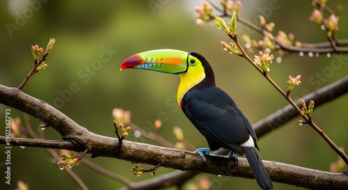Fototapeta premium A vibrant keel-billed toucan stands on a branch adorned with delicate buds.