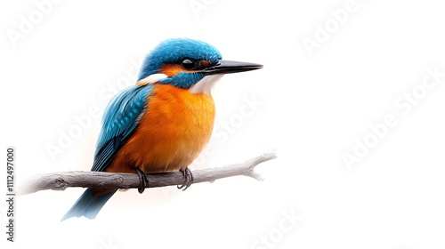 © tonpreecha, Obraz premium A vibrant kingfisher with striking blue and orange feathers, perched elegantly on a branch, captured against a smooth white backdrop. Ultra-Realistic, Photo Realistic, highly detailed,
