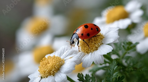Fototapeta premium A vibrant ladybug crawls on a white daisy flower, highlighting the contrast...