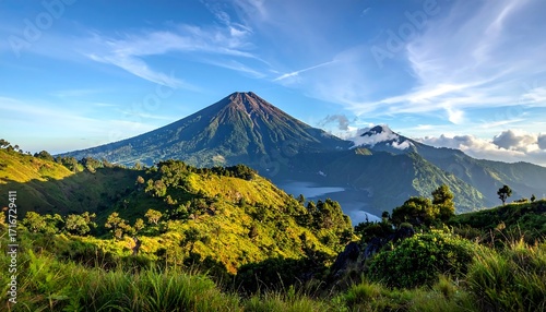 © Mesein, Fototapeta premium A vibrant landscape showcases a majestic volcano, lush greenery, and a tranquil valley, bathed in sunlight.