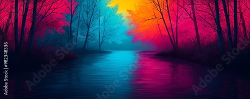 Obraz premium A vibrant landscape showcasing a serene river surrounded by colorful trees...