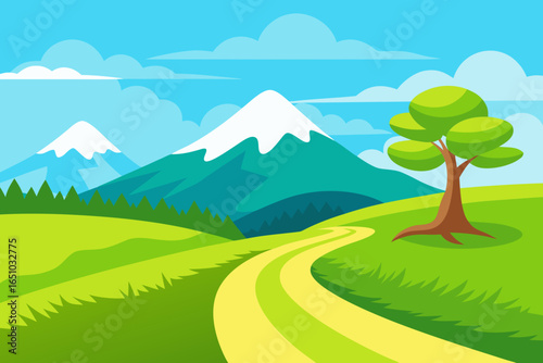 © Anzali Rani, Obraz premium A vibrant landscape with green mountains shimmering in the sunlight.