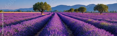 Naklejka premium A vibrant lavender field stretches under a clear sky, with rows of blooming...