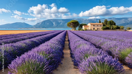© Art_You, Obraz premium A vibrant lavender field with a rustic house and mountain backdrop