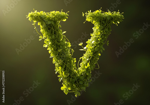 Naklejka premium A vibrant letter v formed from lush green foliage stands out against a blurred background, symbolizing nature, growth, and the beauty of organic forms in a captivating composition