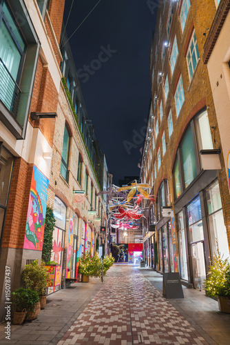 Fototapeta premium A vibrant London street features festive Christmas lights, tall brick buildings, colorful murals, and potted plants, creating a lively holiday atmosphere.
