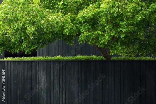 Fototapeta premium A vibrant, lush green tree stands proudly against a sleek black wooden fence,...