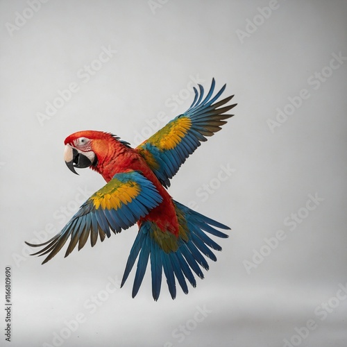 © Veer, Fototapeta premium A vibrant macaw spreading its wings on a white background.