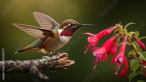© Mahmud, Naklejka premium A vibrant male hummingbird with iridescent plumage hovers beside a branch with hanging fuchsia flowers, capturing the essence of nature's delicate beauty.