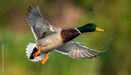 © Amelia, Obraz premium A vibrant mallard duck soars in flight against a soft, blurred background with wings spread gracefully