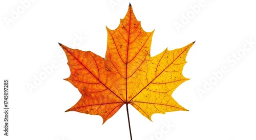Fototapeta premium A vibrant maple leaf with a blend of yellow and orange hues set against a stark white backdrop
