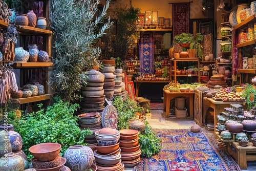 © Iswanto, Fototapeta premium A vibrant market scene filled with pottery, plants, and decorative items.