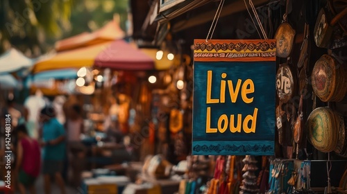 © Hungarian, Naklejka premium A vibrant market stall, displaying a "Live Loud" sign.