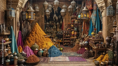 © Iswanto, Fototapeta premium A vibrant marketplace filled with colorful spices and traditional decor.