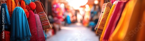 Fototapeta premium A vibrant marketplace scene showcasing colorful fabrics hanging on display, leading to a bright, softly blurred background.