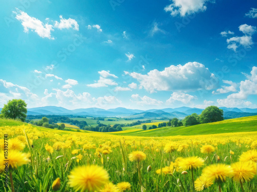 Obraz premium A vibrant meadow filled with blooming yellow dandelions under a bright blue...