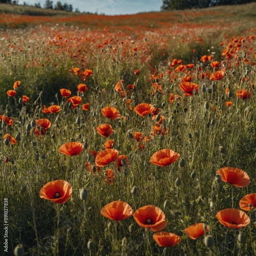 Fototapeta premium A vibrant meadow filled with poppies swaying in the breeze.