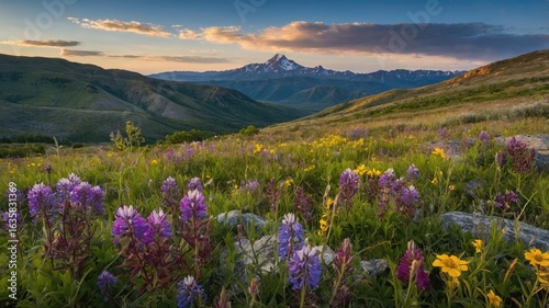 Fototapeta premium A vibrant meadow with wildflowers and majestic mountains.