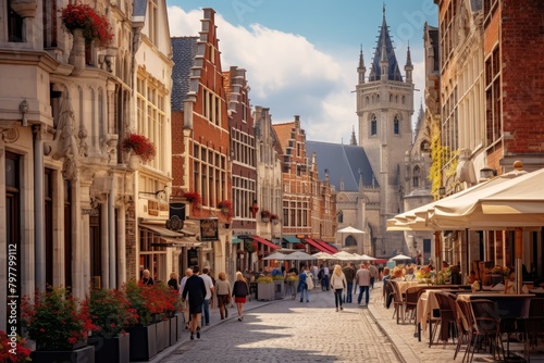 Fototapeta premium A Vibrant Medieval Town Square Bustling with Activity, Featuring Cobblestone...