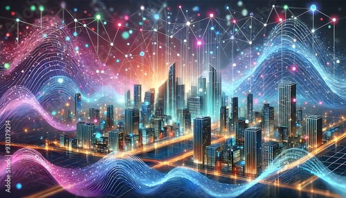 Fototapeta premium A vibrant metropolis with glowing data networks overhead, representing the...