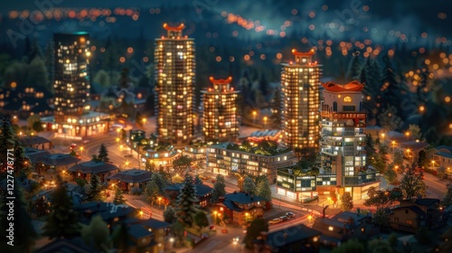 Obraz premium A vibrant miniature cityscape at night, showcasing illuminated buildings and a serene atmosphere