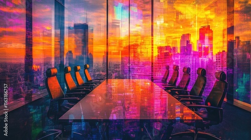 © ShinneProject, Obraz premium A vibrant, modern conference room with a city skyline at sunset.