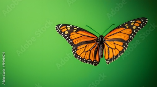 © QITIAN, Fototapeta premium A vibrant Monarch butterfly gracefully soaring against a green backdrop.