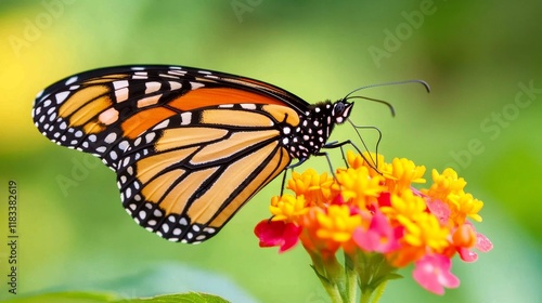 © chusnul, Fototapeta premium A vibrant monarch butterfly perched on a colorful flower in a natural setting.