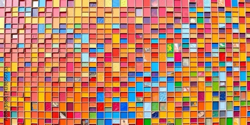 © Teenawat, Fototapeta premium A vibrant mosaic wall in Spain, featuring colorful pixelated tiles, offers ample blank space, pixel, light