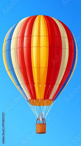 Naklejka premium A vibrant, multicolored hot air balloon ascending against a clear blue sky