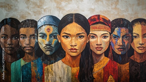 Naklejka premium A vibrant mural depicting diverse faces with cultural expressions, showcasing unity and heritage