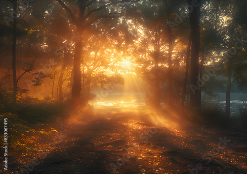 © MistoGraphy, Naklejka premium A vibrant nature rainforest at dusk, the last light of the day creating long shadows and a serene atmosphere