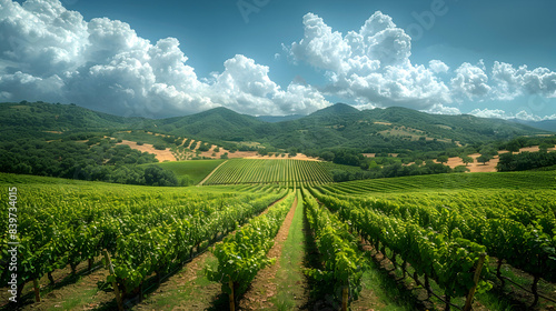 © MistoGraphy, Fototapeta premium A vibrant nature vineyard landscape with a variety of grapevines creating a lush environment