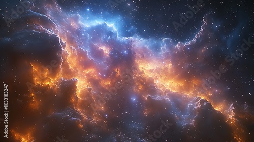 Fototapeta premium A vibrant nebula with swirling clouds of gas and dust, illuminated by stars in a deep space scene.