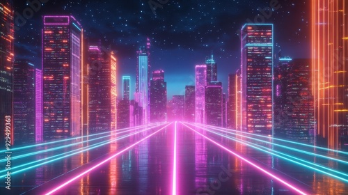Fototapeta premium A vibrant neon cityscape at night with glowing buildings and reflective roads.