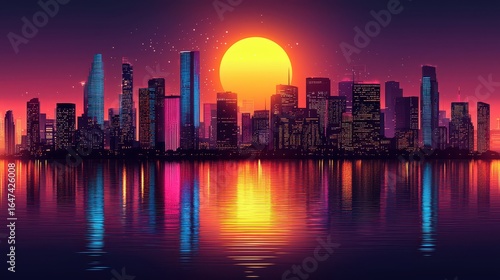Fototapeta premium A vibrant, neon-infused cityscape pulsates in a geometric abstract style, its...