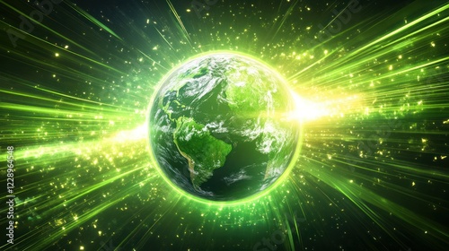 © Hardy, Obraz premium A vibrant news background featuring a 3D Earth globe surrounded by bright green belt lines and dynamic light effects.