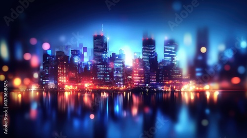 Fototapeta premium A vibrant night view of a city skyline reflecting on water, showcasing...