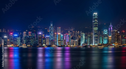 © golekduetdolaR, Fototapeta premium A vibrant nighttime panorama of a modern cityscape with illuminated skyscrapers reflecting colorful lights on the calm water below.