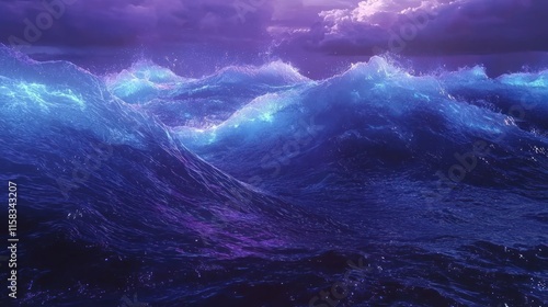 Fototapeta premium A vibrant ocean scene with waves illuminated by purple and blue hues under a...