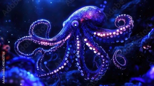 © fara, Obraz premium A vibrant octopus gliding through a colorful underwater scene filled with shimmering lights.
