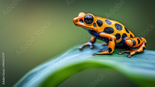 © BerkahStock, Fototapeta premium A vibrant orange and black spotted frog perched on a green leaf, showcasing its natural beauty.