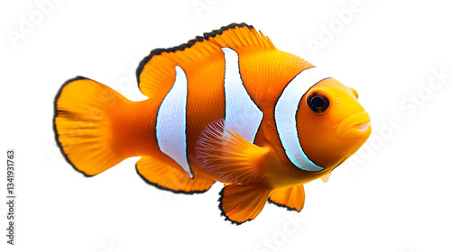 Naklejka premium A vibrant orange and white clownfish swims, isolated on a black background,...