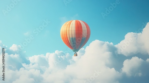© Nathan, Fototapeta premium A vibrant orange and yellow hot air balloon soaring through a clear blue sky with fluffy white clouds.
