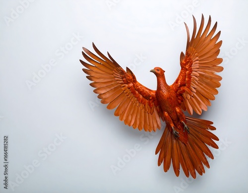 © Meta, Obraz premium A vibrant orange bird in flight, wings spread wide against a muted gray backdrop