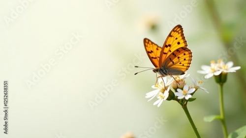 Fototapeta premium A vibrant orange butterfly delicately perched on a cluster of pristine white wildflowers, basking in the soft sunlight, creating a serene and picturesque natural scene.