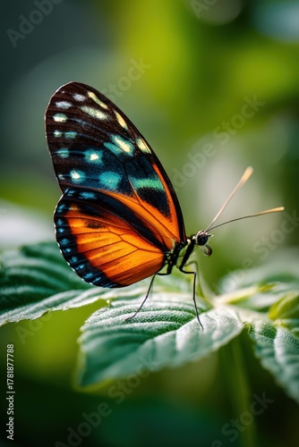 © Valentina, Obraz premium A vibrant orange butterfly perched gracefully on a green leaf with sunlit bokeh background
