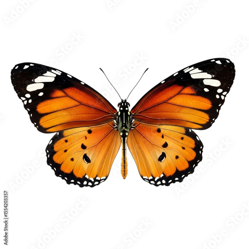 © Md, Fototapeta premium A vibrant orange butterfly with black and white markings is centered in the image