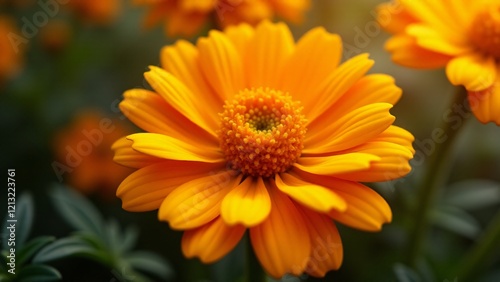© Ernesto, Fototapeta premium A vibrant orange calendula with textured, round petals radiating outward. The central yellow stamens contrast with the bold petals, creating a lively and cheerful floral glow in soft sunlight.