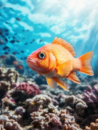 Fototapeta premium A vibrant orange fish gracefully swims among colorful coral in a sunlit underwater scene, showcasing the beauty of marine life.